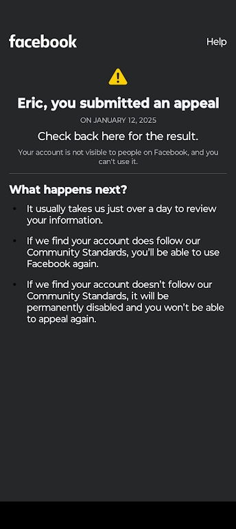 This is what it looks like when your Facebook gets suspended. It logged me out of all of my Facebook associated accounts including: Instagram, Messenger, Threads, and Facebook just shows this message. I feel like the timing could not be perfect because- Trump has won, I did what I set out to do, which was to spread the good news about President Trump.