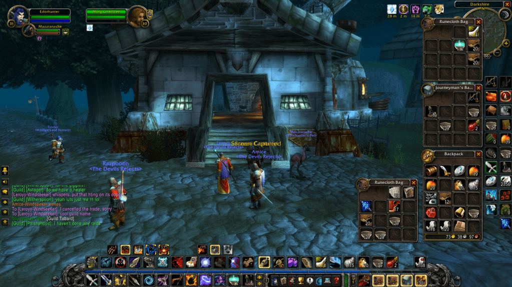 I played last night. I ended up in a new guild, The Devil’s Rejects. Pretty neat guild name, the tabard is pretty good to, though this screenshot doesn’t quite show it. In fact, you can barely see my Night Elf Hunter, lol. I ended up playing on Starwarrior as well, because I helped a guildie get his Whirlwind Axe. It didn’t take that long, at lvl 60. I enjoyed it though. That was after running Razerfen Kraul.