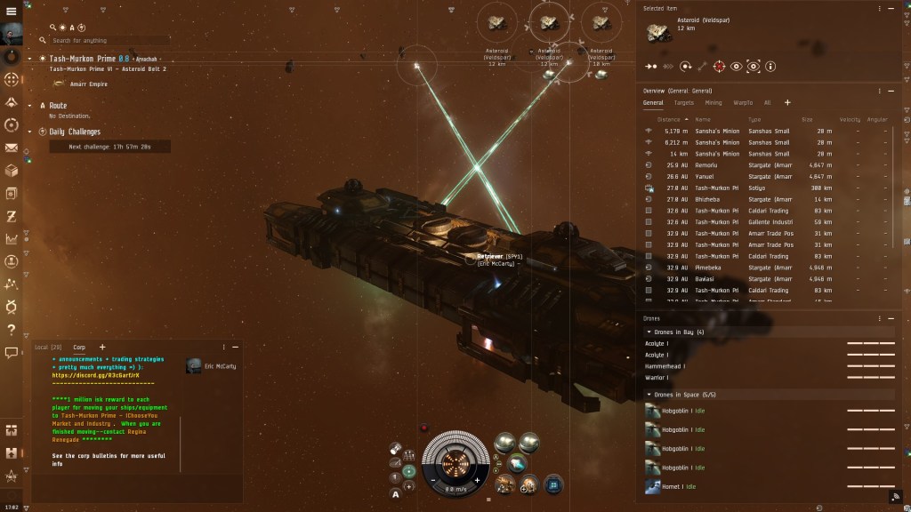In the mean time, I just run missions and shoot rats. Waiting. Waiting for someone, anyone in my corporation to sign on and I will ask them for help moving my stuff, from low sec.